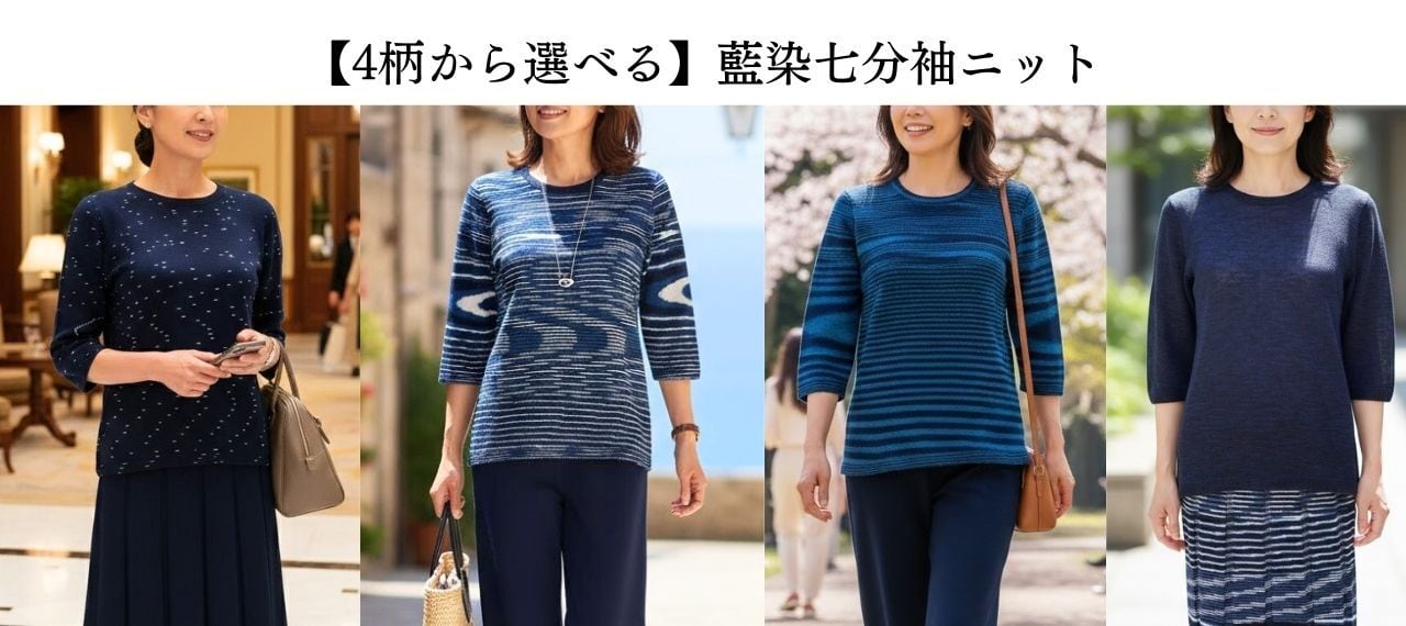 【4柄から選べる】藍染七分袖ニット|丸衿・ホールガーメント
