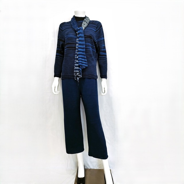 ◆ハイネックドルマン風セーター(二色段染)・長袖 :ホールガーメント 二色段 M〜L 綿100% ¥29,700円(税込) 単品でのご購入はこちら ==> https://amiarm.base.ec/items/120401917 ◆パンツ :ホールガーメント 紺無地 裏生地:ポリエステル100% M〜L 綿100% ¥41,800円(税込) 単品でのご購入はこちら ==> https://amiarm.base.ec/items/77578536 ◆藍染ニットストール(大)(二色・くくり・雪ん子・三色) 二色段染・くくり・雪ん子・三色段染 / 綿100% ¥6,600円(税込) 単品でのご購入はこちら ==> https://amiarm.base.ec/items/78115654