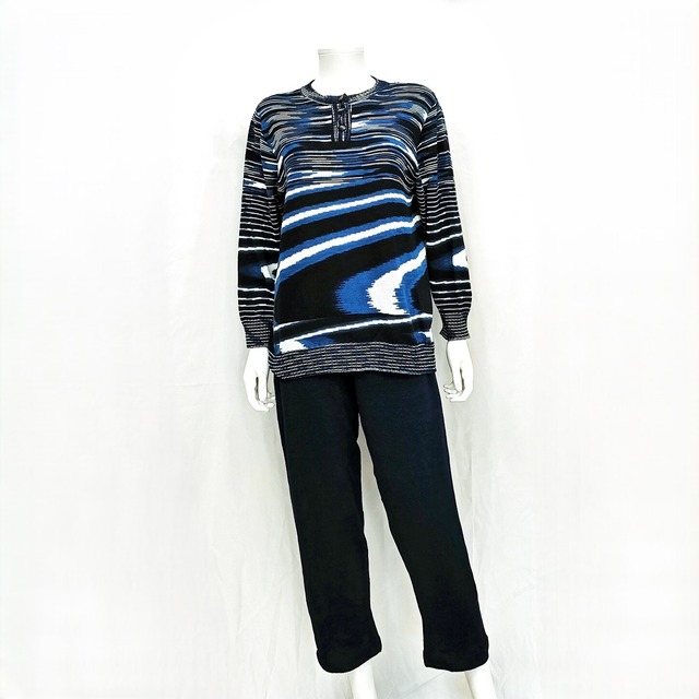 ◆ヘンリーネックセーター :ホールガーメント 三色段染 M〜L 綿100% ¥30,800円(税込) 単品でのご購入はこちら ==> https://amiarm.base.ec/items/121303480 ◆テーパードパンツ :ホールガーメント 紺無地 裏生地:ポリエステル100% M〜L 綿100% ¥41,800円(税込) 単品でのご購入はこちら ==> https://amiarm.base.ec/items/83899524