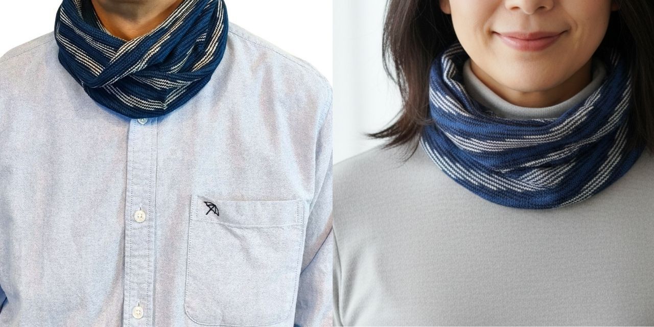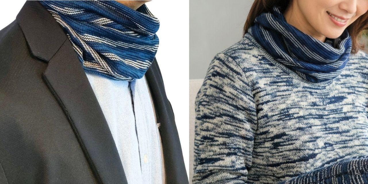 藍染のネックウォーマーは、軽量ながらも保温性に優れ、