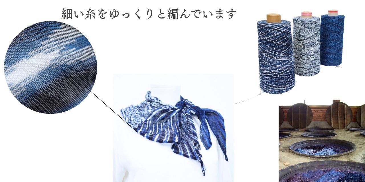 藍に染めた糸をニットストールに編んでいく。この技術は、弊社オリジナルの技術です。
