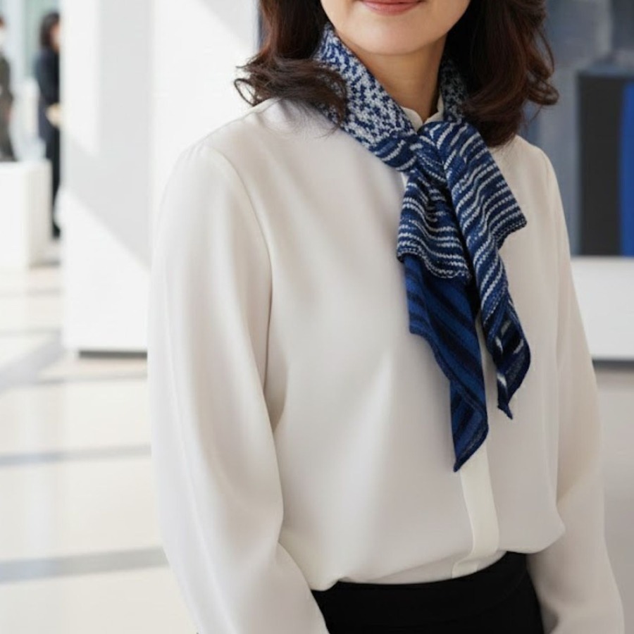 オフィスで:シャツの襟元に結んで、洗練された大人の印象に