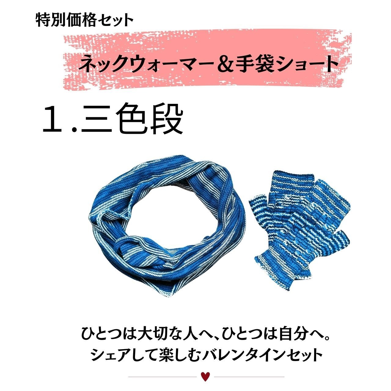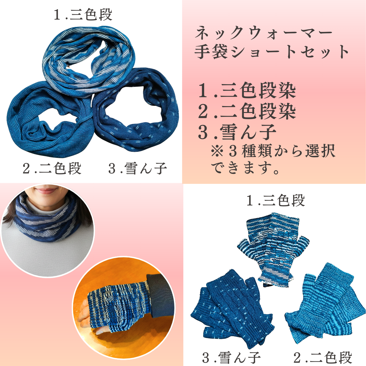 1.三色段染セット/藍染ニットネックウォーマー・手袋ショート/綿100%