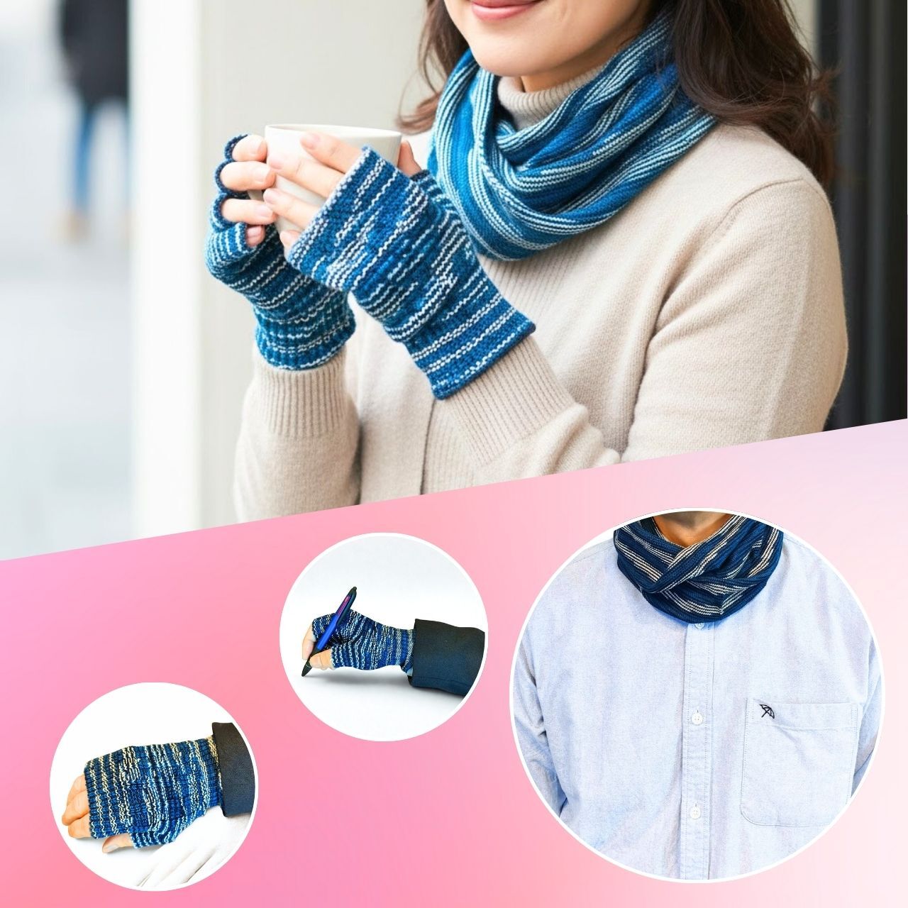 ネックウォーマーは、豊かな藍染の模様が際立ち、手袋との組み合わせでおしゃれなスタイルを楽しむことができます。